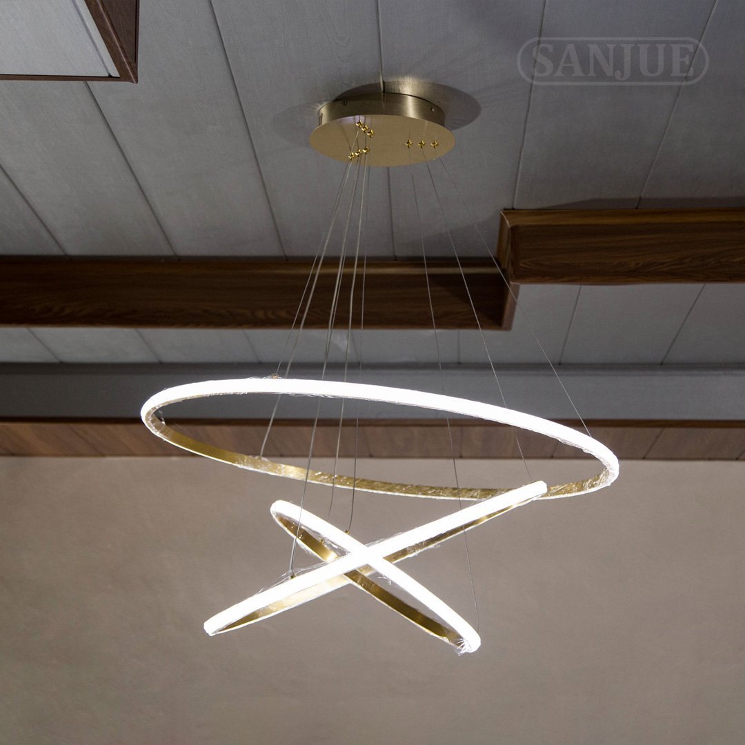 Lámpara Colgante de 3 anillos cruzada, diseño exclusivo que le brinda un entorno moderno y resaltando todo el espacio, para Sala, comedor y salón de evento le da un toque de mucha calidad en su iluminación